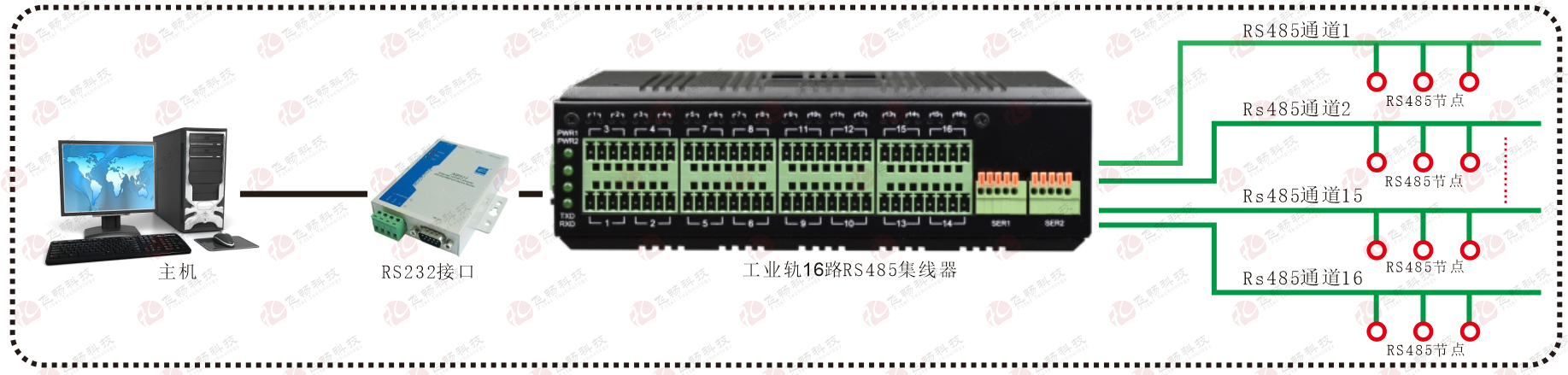 • HJCA16海角官网科技-工业轨式 16路RS485集线器