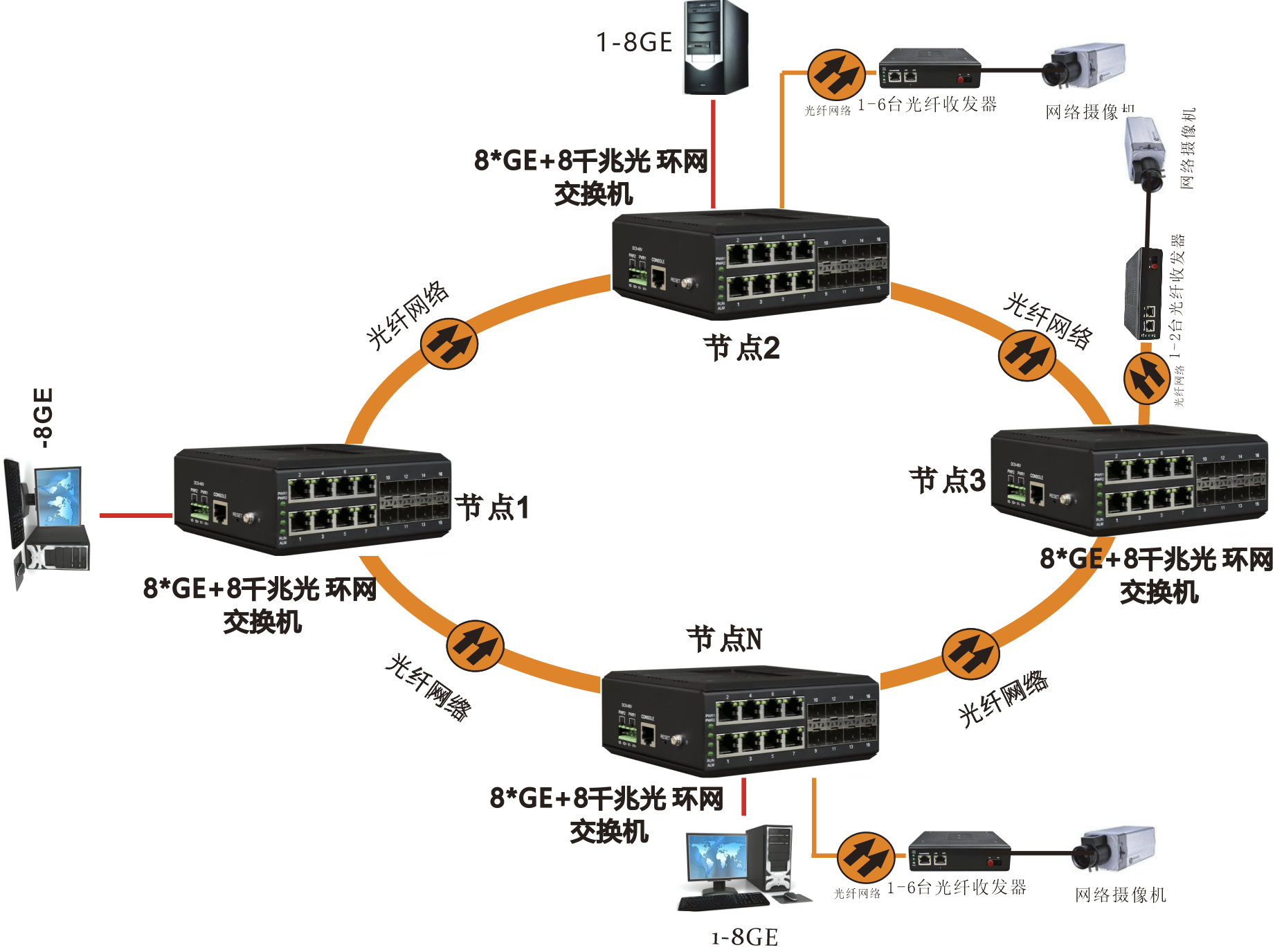 u 本产品集8路千兆电口与8路千兆光口,可以组成冗余环拓扑结构,