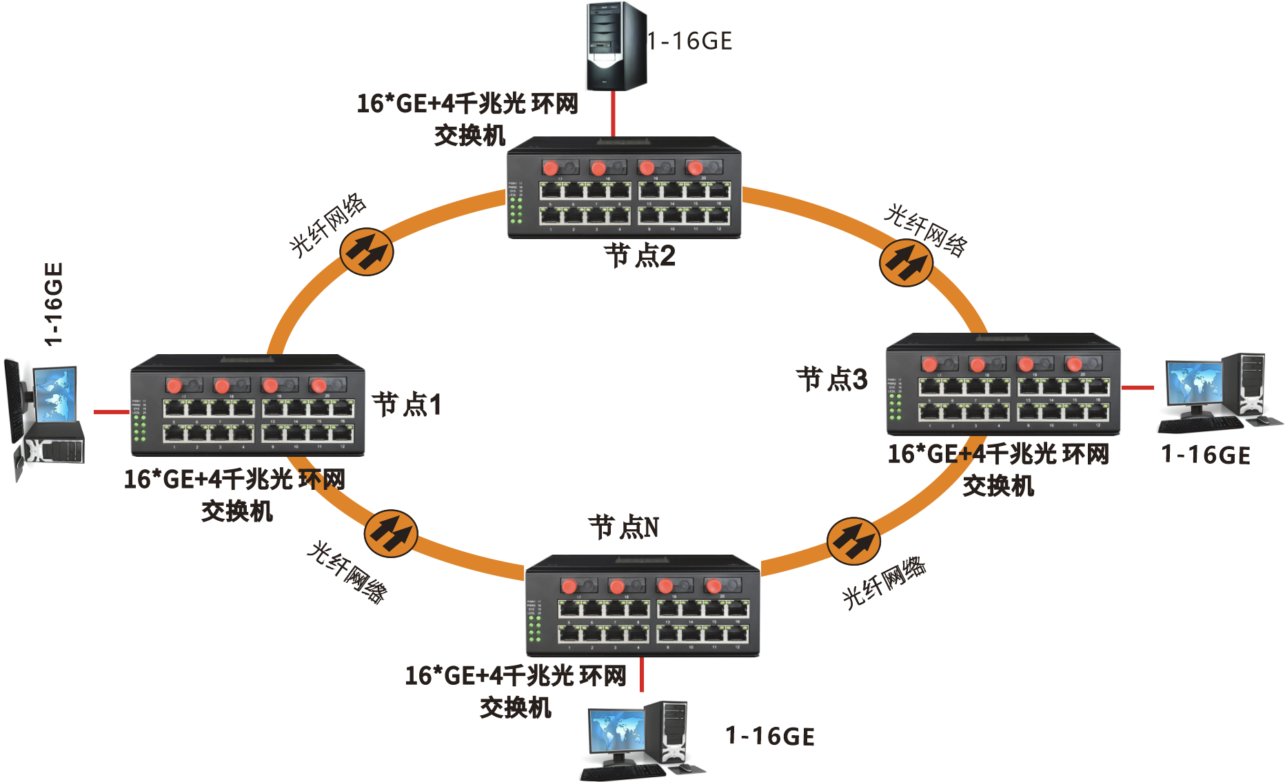 ◆  本产品集16路千兆电口与4路千兆光口,可以组成冗余单环拓扑结构,